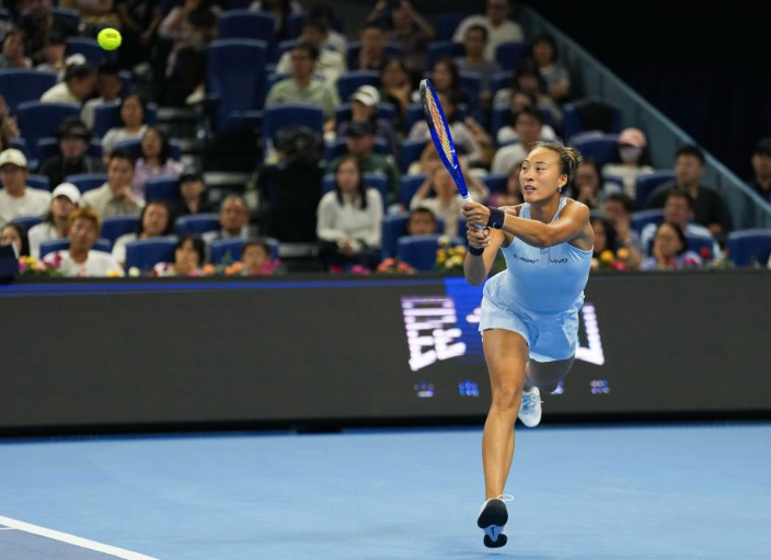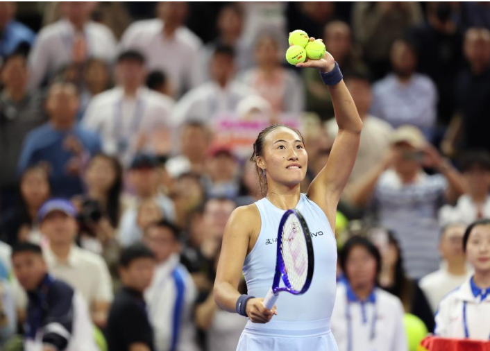 9月29日,郑钦文在比赛中。  当日,在北京举行的2025中国网球公开赛女单第三轮比赛中,中国选手郑钦文对阵捷克选手诺斯科娃。比赛进