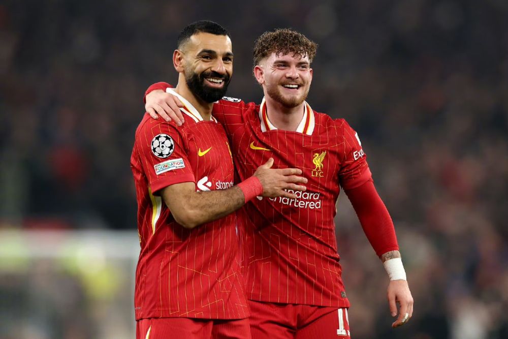 利物浦球员萨拉赫(左)和队友埃利奥特庆祝进球。图片来自利物浦足球俱乐部官方社交账号