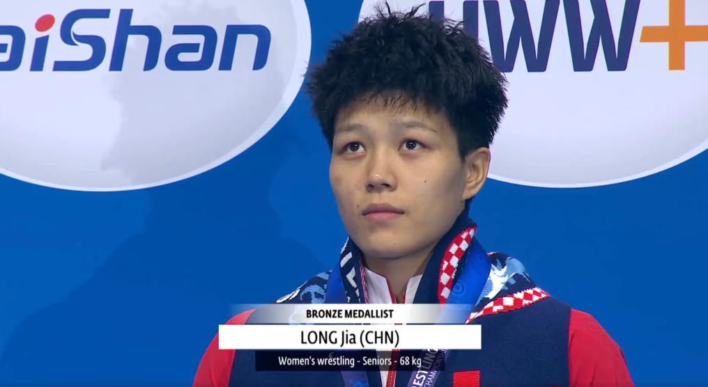龙佳在2025摔跤世锦赛女子68公斤级颁奖典礼上