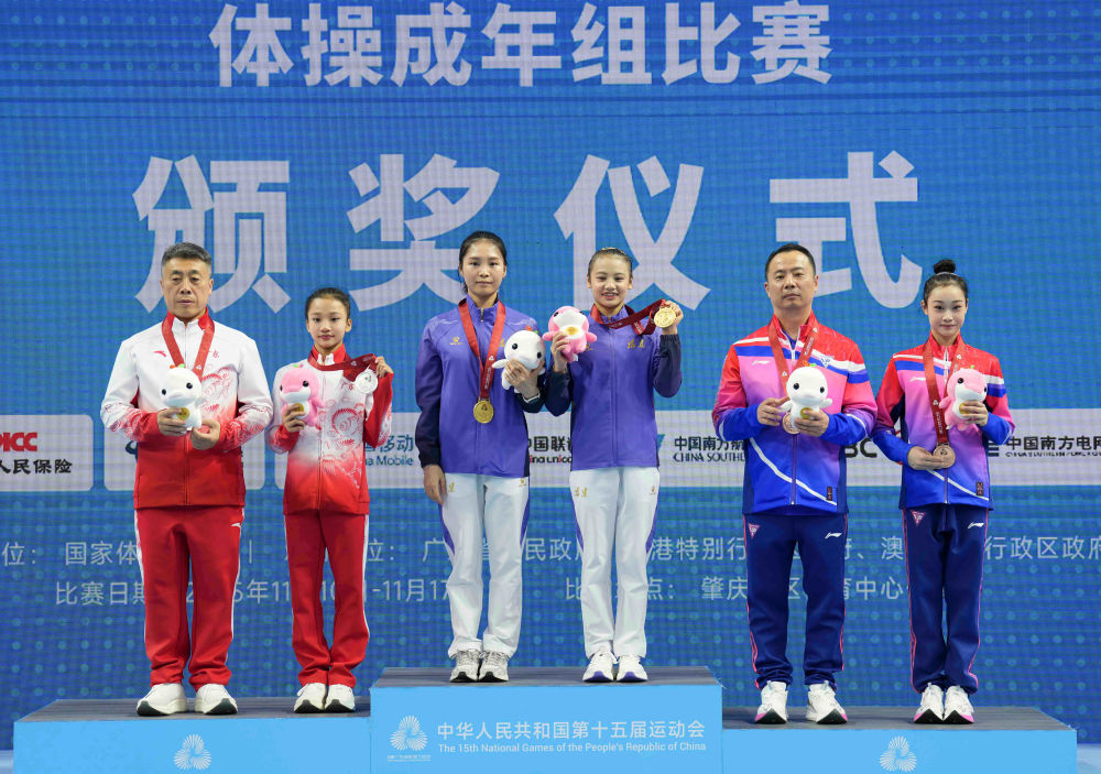 11月16日,冠军福建队选手邱祺缘(右三)、亚军广东队选手钟圻(左二)和季军上海队选手秦心怡(右一)与教练在颁奖仪式上合影。新华社记者 胥冰洁 摄