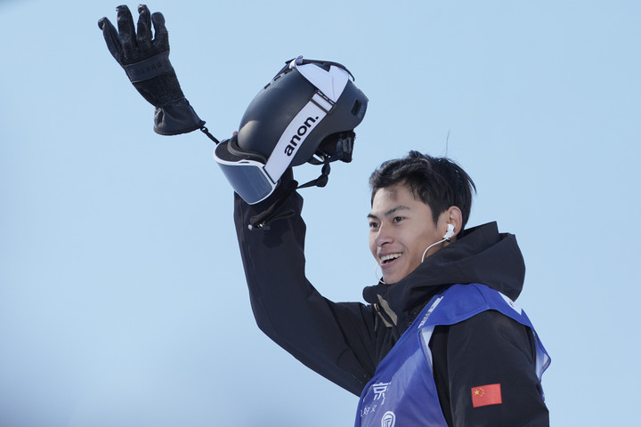 11月27日,中国单板滑雪运动员苏翊鸣在资格赛晋级后庆祝。新华社记者 卢星吉 摄