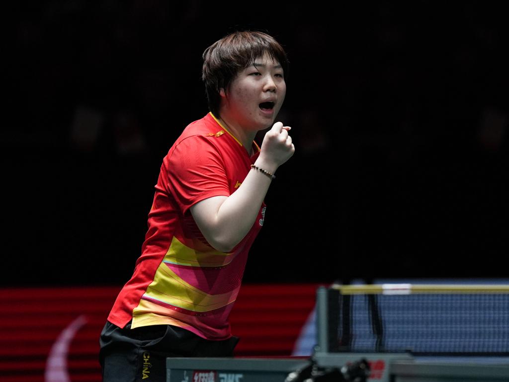12月7日,蒯曼在半决赛女单比赛中庆祝得分。新华社记者 王曦 摄