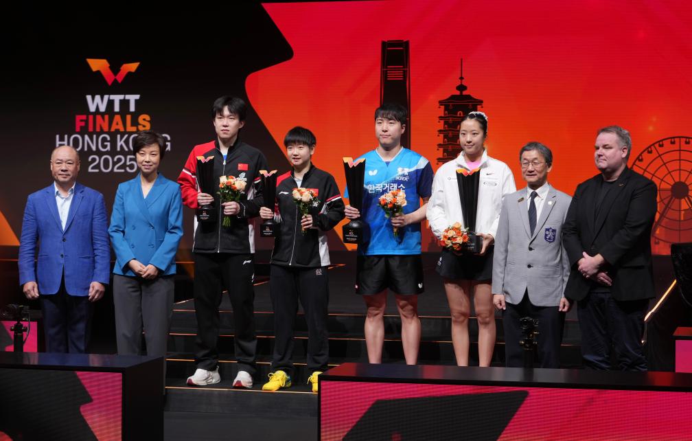 12月13日,冠军韩国组合林钟勋(右四)/申裕斌(右三)、亚军中国组合王楚钦(左三)/孙颖莎(左四)和颁奖嘉宾在颁奖仪式上。新华社发(吕小炜摄)