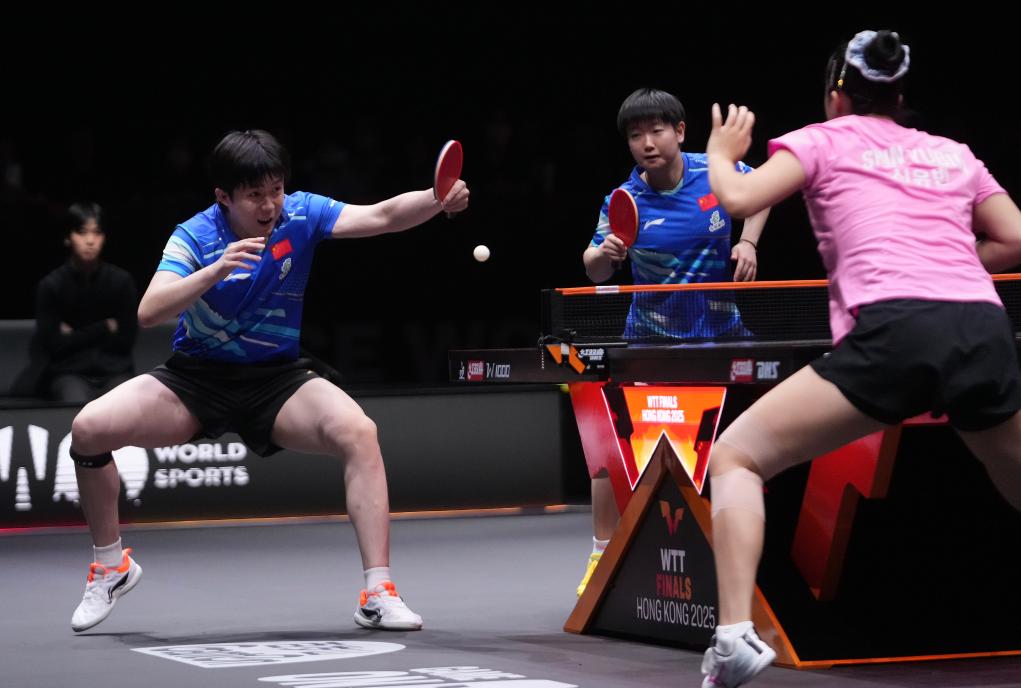 12月13日,王楚钦(左)/孙颖莎在混双决赛中。新华社发(吕小炜摄)