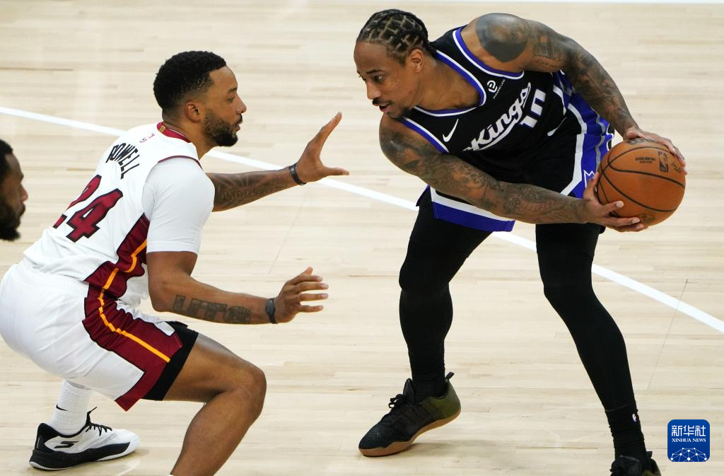 1月20日,国王队球员德罗赞(上左)与热火队球员巴姆·阿德巴约(上右)在比赛中。