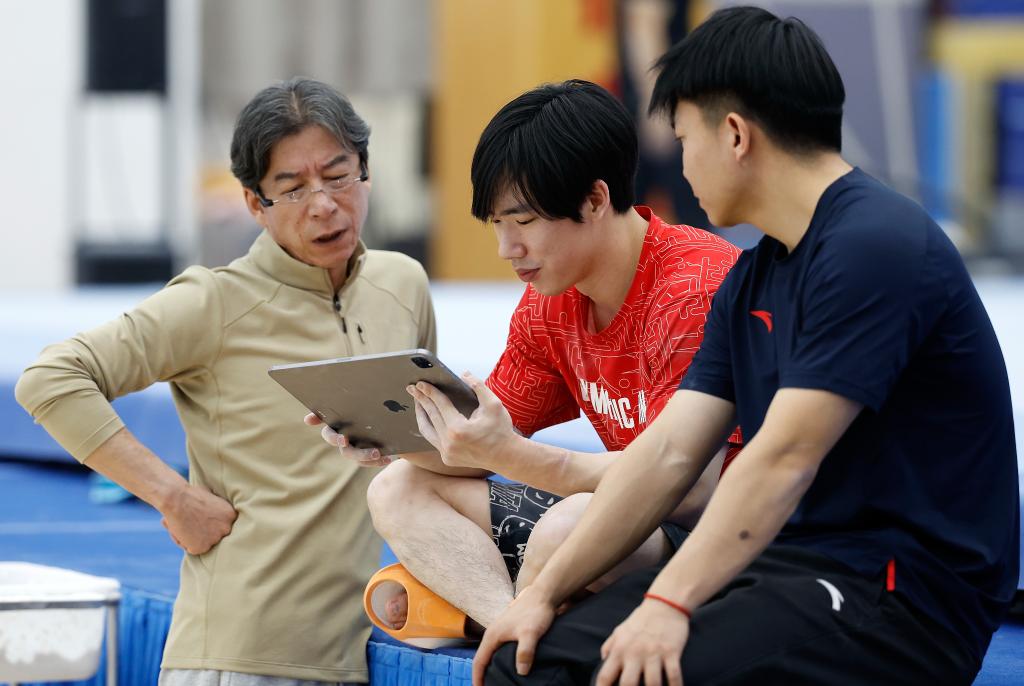 1月31日,张博恒(中)与中国男子体操队教练组组长金卫国(左)一起查看训练录像。新华社记者 王丽莉 摄