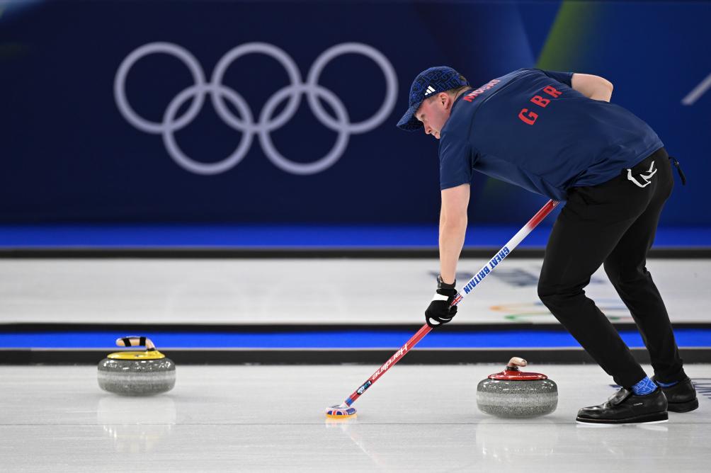 ↑2月4日,英国队布鲁斯·莫阿特在对阵挪威队的比赛中。新华社记者 连漪 摄