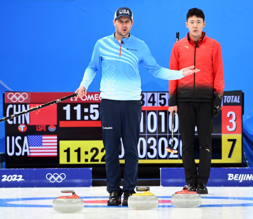 ↑2022年2月13日,在“冰立方”举行的北京冬奥会男子冰壶循环赛中,中国队以6:8负于美国队。新华社记者 李贺 摄