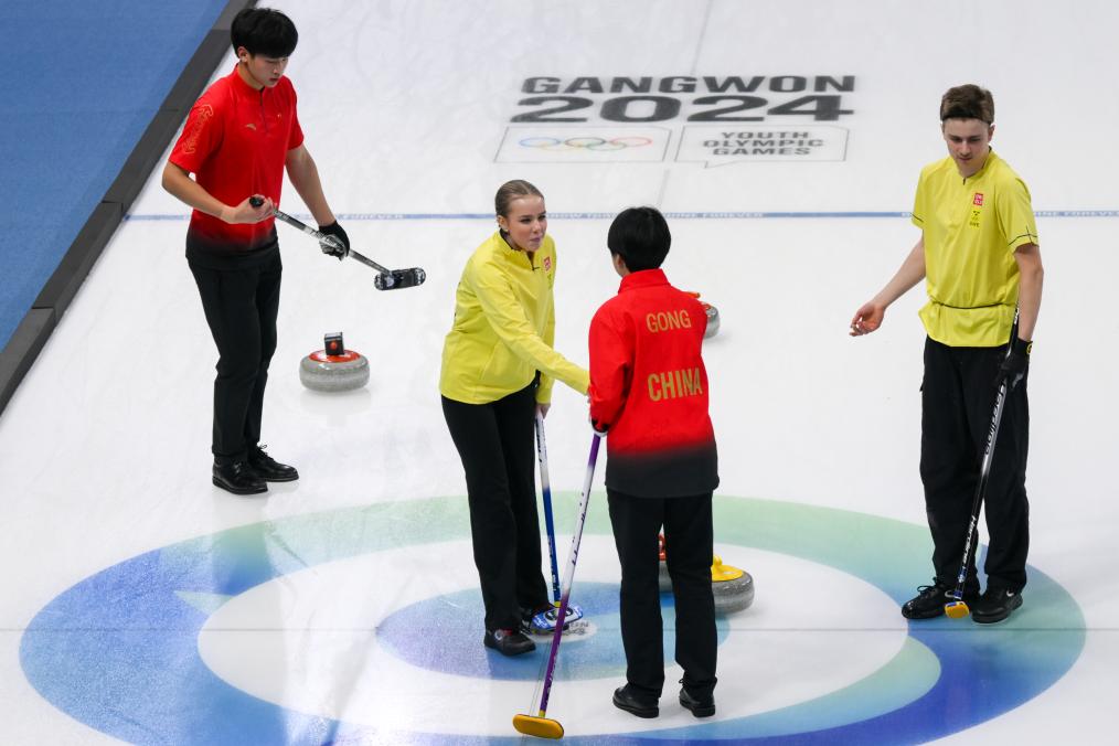 ↑2018年平昌冬奥会冰壶混双比赛中,中国选手巴德鑫、王芮获得第五名。新华社记者 马平 摄