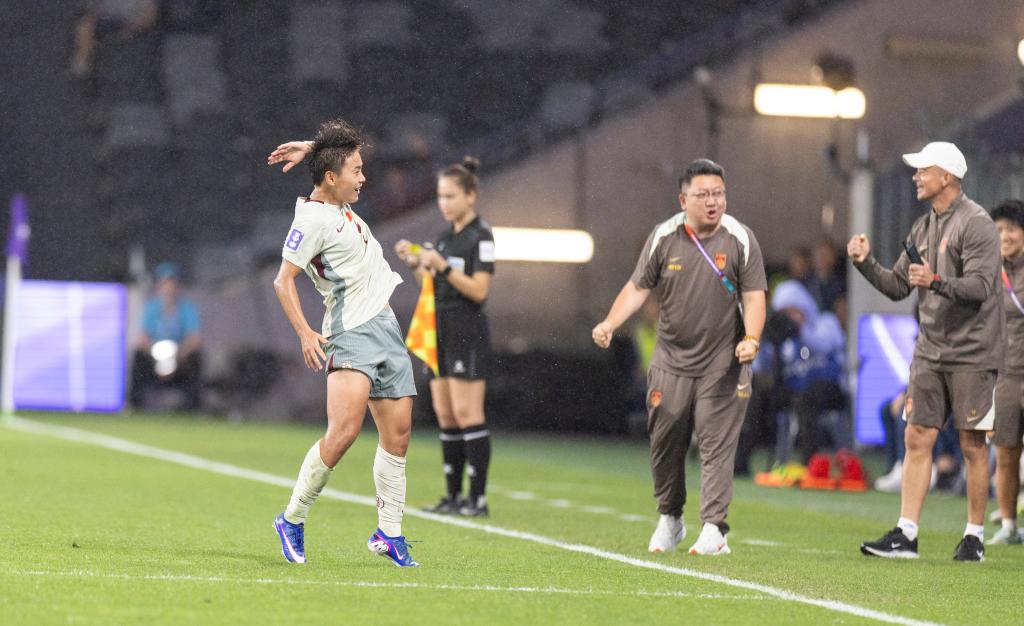 3月9日,中国队球员王霜(左)庆祝进球。新华社发(胡泾辰 摄)