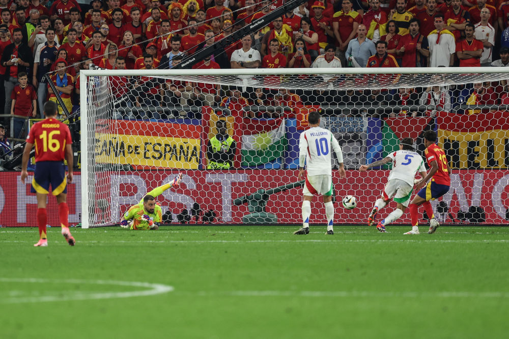 下半场西班牙队延续攻势,威廉姆斯继续成为球队爆点,与他对位的意大利队边后卫迪洛伦佐苦不堪言。第55分钟,威廉姆斯边路传中,莫拉塔前点头球攻门被唐纳鲁马单掌扑出,但意大利队后卫卡拉菲奥里避闪不及自摆乌龙,“斗牛士”军团1:0领先。