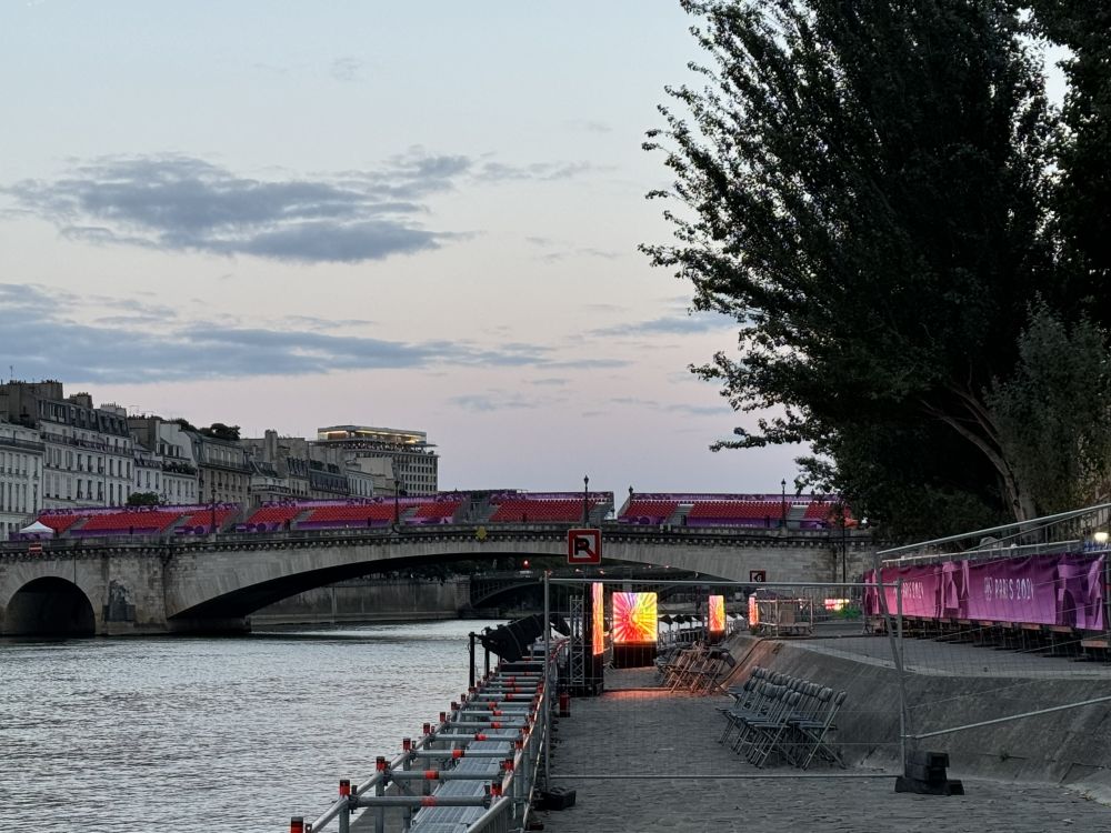 10点半,天色暗下来,封锁区内更是陷入寂静,与几天前相比,河岸上的观众席已经安装得整整齐齐,最上面还挂上了奥运会的标志。在交易桥和圣母院桥之间100多米的河岸旁,还安装了10个大音箱。在圣母院上游托内尔桥旁的观众席前面,6个大屏幕在闪烁。托内尔桥是开幕式船队出发后经过的第二座桥,桥上也安装了观众席。