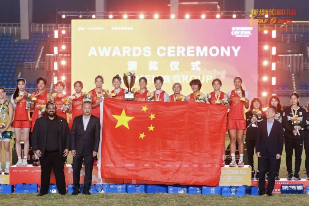 中国女子腰旗橄榄球国家队在亚大锦标赛颁奖仪式上